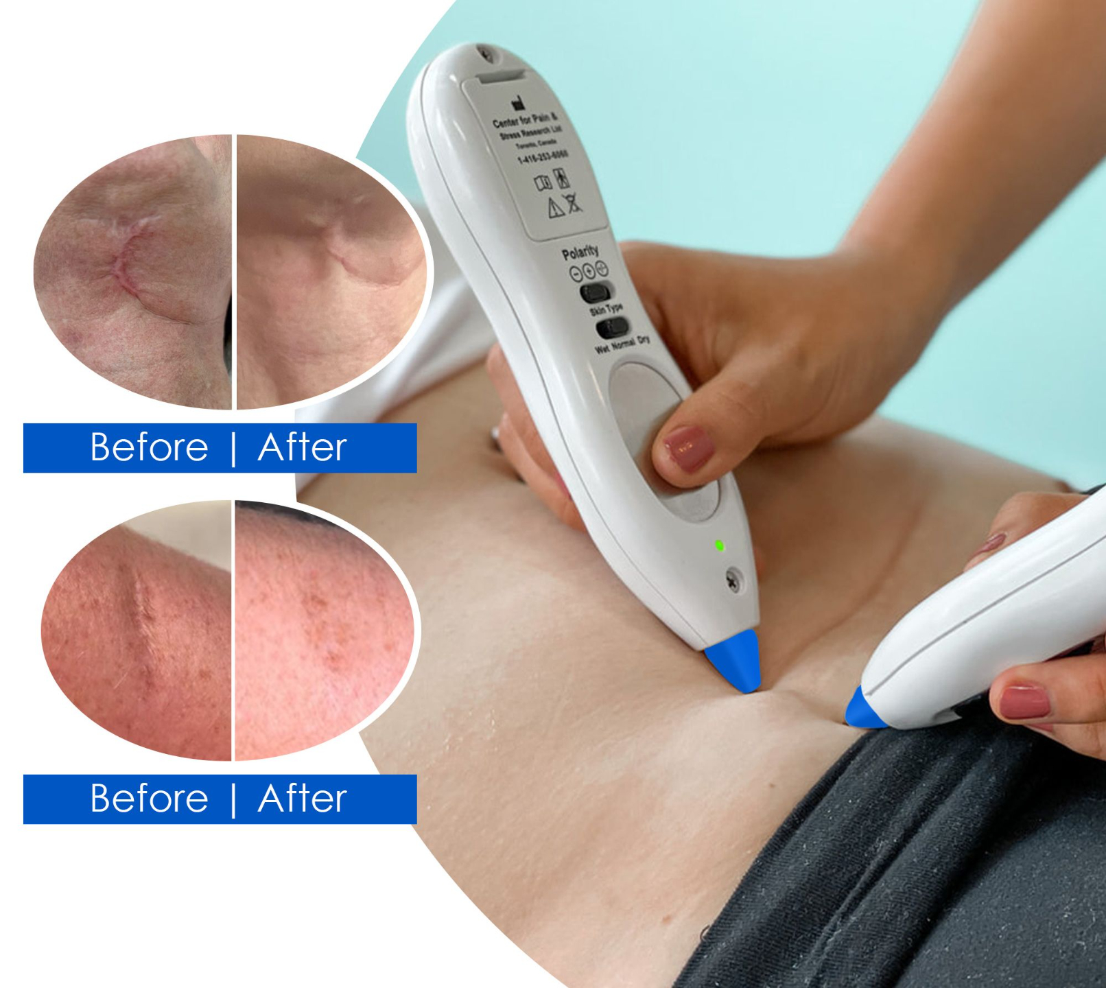 The technique involves the simultaneous application of a safe low level electrical impulse to each side of the Physical scar. The microcurrent helps to relax and fade scar tissue, which can impede the functioning of muscles, fascia, and cause pain.